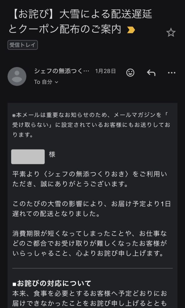 1月下旬の大雪で到着が1日遅れとなりました。この時は以下のようなメールが送付され『500円クーポン』が配布されました!