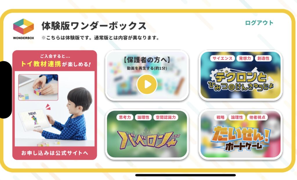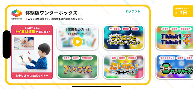 資料請求すると7日間限定でアプリの無料体験ができます!私が資料請求した9月末時点では3つのアプリを無料体験できました!実際に私と子供で一緒に3つのアプリをやってみました!特にバベロン+は、問題が進むにつれて難易度がレベルアップし、頭を使う問題が盛りだくさんでした!