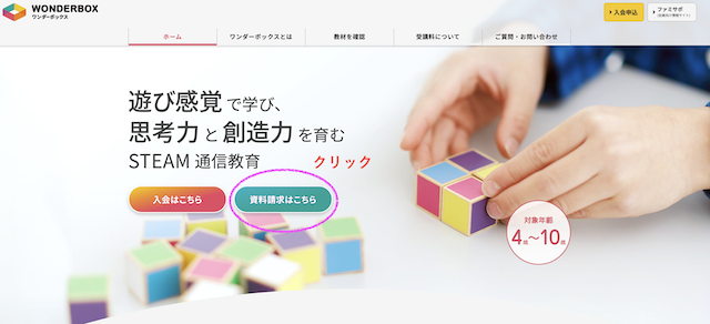 ワンダーボックス公式サイトへいき、「資料請求はこちら」→「資料請求に申し込む」をクリック!